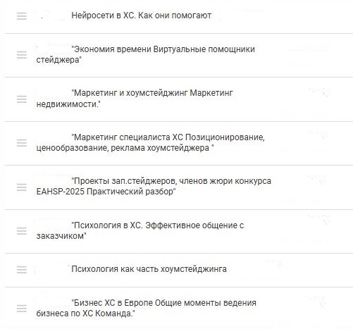 Кроме того, и студенты,и выпускники сразу получают возможность присутствовать бесплатно на занятиях "закрытого клуба", т.е. международного сообщества русскоязычных хоумстейджеров, где делюсь знаниями от мировых лидеров индустрии. Этого нет на русском языке, просто потому, что учатся на английском или других языках единицы граждан постсоветского пространства. Уже провела более 30 встреч с мая 2024г. (ниже вы найдете примеры тем и отзыв о встрече)
