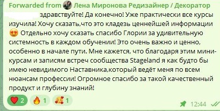 "Уже практически все курсы изучила! Хочу сказать,что это кладезь ценнейшей информации😍 Отдельно хочу сказать спасибо Глории за удивительную системность в каждом обучении! Это очень важно и ценно, особенно в начале пути. Мне кажется, что благодаря этим мини-курсам и записям встреч сообщества Stageland я как будто бы имею невидимого Наставника, который ведёт меня по всем нюансам профессии! Огромное спасибо за такой качественный продукт и глубину знаний!"